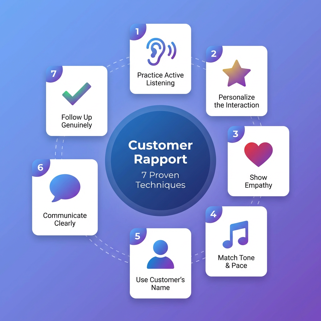 - The 7 core rapport building techniques — active listening, personalization, empathy, tone matching, using the customer’s name, clear communication, and follow-up — can be trained and reinforced at scale.